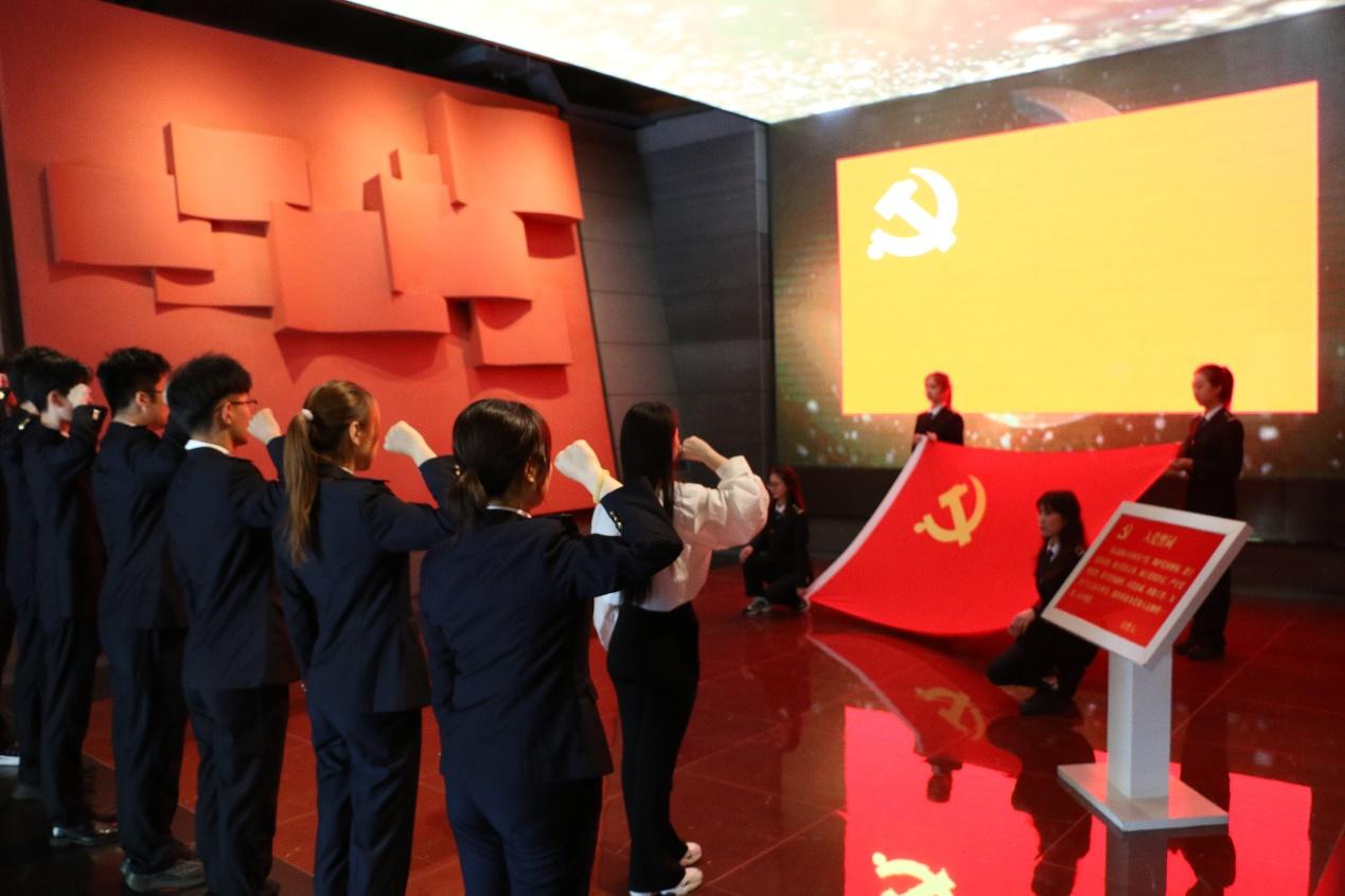 在历史选择馆,带队教师党员为学生上了一堂题为《为什么是共产党》的党课,引导学生在重温历史中深刻思考、接受洗礼,自觉认识到中国共产党为什么“能”,从而进一步坚定理想信念、锤炼坚强党性。党课结束后,师生党员面向党旗庄严宣誓,重温入党誓词,坚定共产党员不变的初心和使命。
